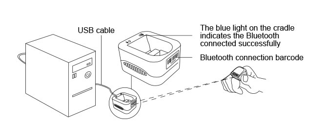 Step 2: Use the ring scanner to scan the barcode on the side of the charging base. When the ring scanner's indicator light flashes green and the base's Bluetooth indicator turns blue, the connection is successful.